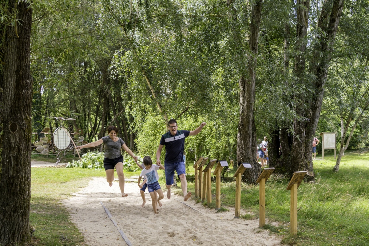 Laissez vos chaussures de côté et parcourez Réveille tes pieds : sur près d’un kilomètre, plus de 45 matériaux différents à tester pieds nus ! Près de l’aire de jeux centrale, Active tes sens se parcourt les yeux fermés : Sans la vue, faites confiance aux sens de l’ouïe et du toucher !